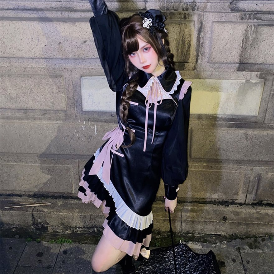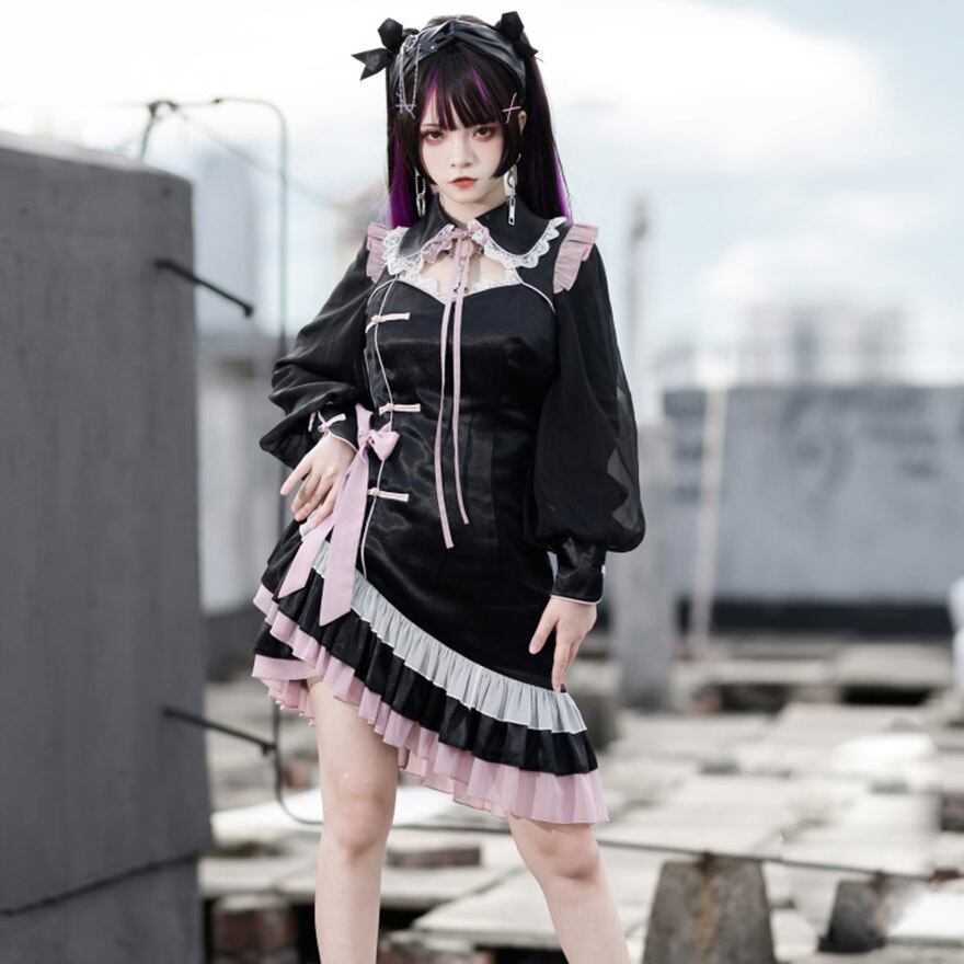 サブカル 服 地雷系 通販 チャイナ風ワンピース 長袖 襟付き リボン ロリィタ服サブカルファッション