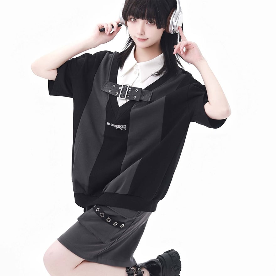 サブカル 服 地雷系 通販 pinksavior 半袖シャツ フェイクレイヤード 重ね着風 シャツ 半袖 トップス 太ストライプ 闇かわいい