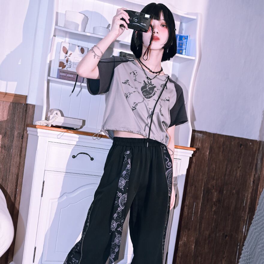 サブカル 服 地雷系 通販 チャイナ風服 チャイナ風服 古怪舎 Tシャツ 半袖トップス フード付き 裾絞り ドロスト 闇かわいい