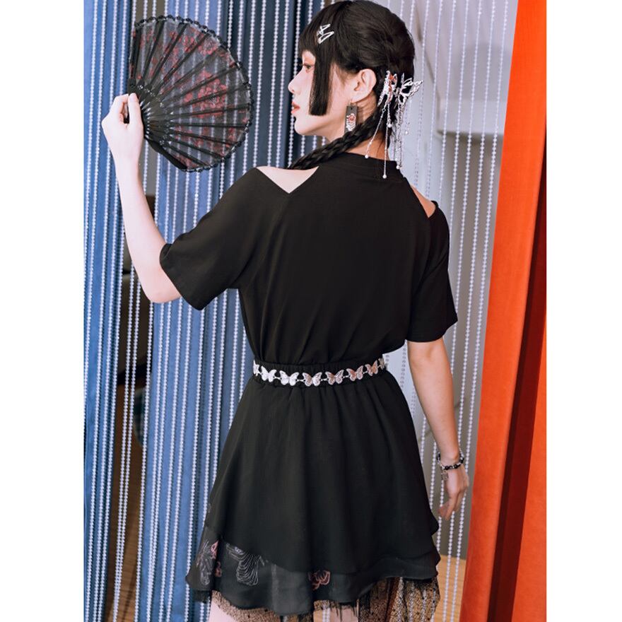 サブカル 服 地雷系 通販 チャイナ風服 チャイナ風服 古怪舎 スカート ミニ丈 レイヤード レース ランダムカット イレギュラーヘム 闇かわいい