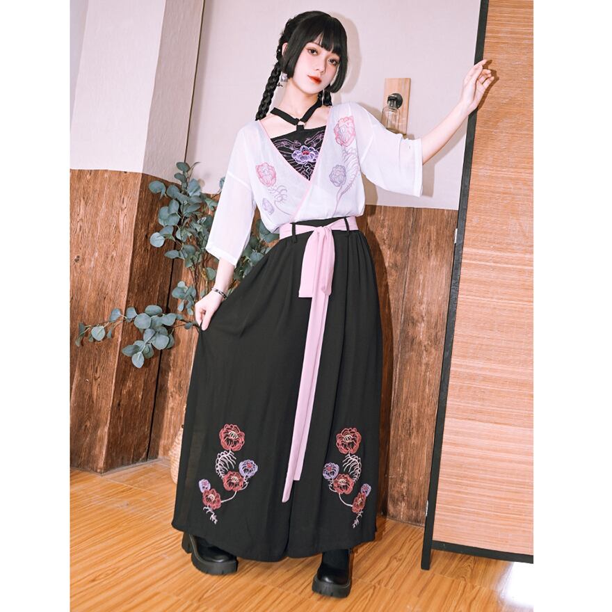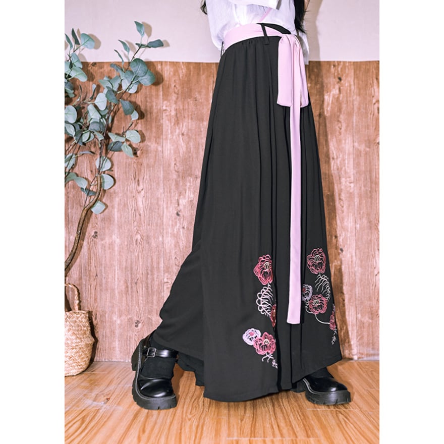 サブカル 服 地雷系 通販 チャイナ風服 チャイナ風服 古怪舎 スカート風 ワイドパンツ 袴 ウエストリボン 花柄刺繍 ドレープ 闇かわいい