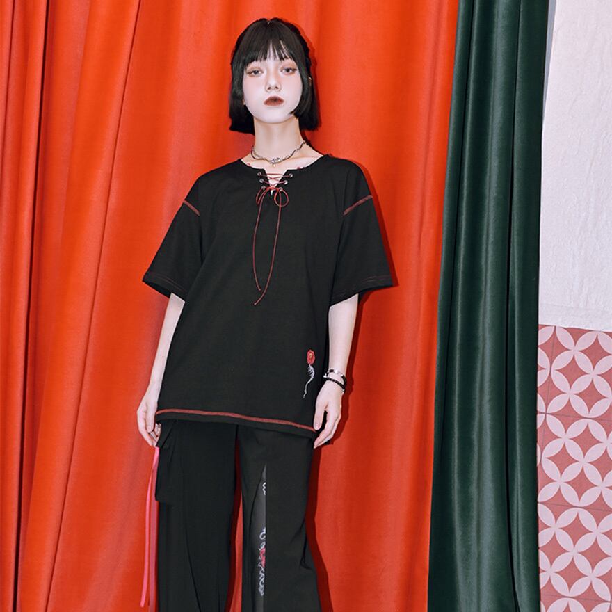 サブカル 服 地雷系 通販 チャイナ風服 チャイナ風服 古怪舎 Tシャツ 半袖トップス バックプリント フラワーボーン レースアップ 闇かわいい