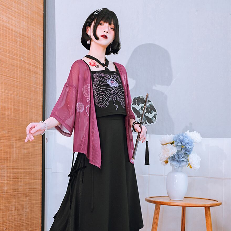 サブカル 服 地雷系 通販 チャイナ風服 チャイナ風服 古怪舎 キャミソール スカル フラワー ショート丈 クロスネック ホルターネック 闇かわいい