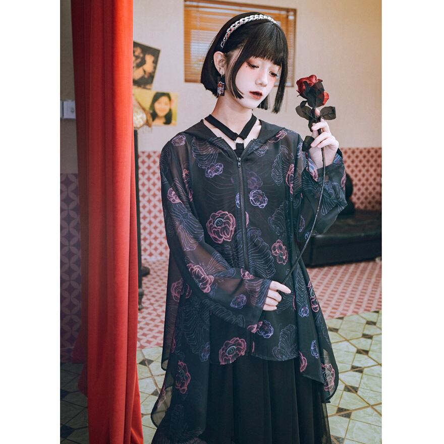 サブカル 服 地雷系 通販 チャイナ風服 チャイナ風服 古怪舎 カーディガン 羽織り パーカー 透け感 シアー シフォン 闇かわいい