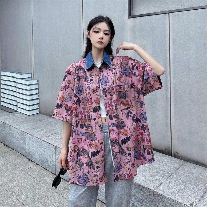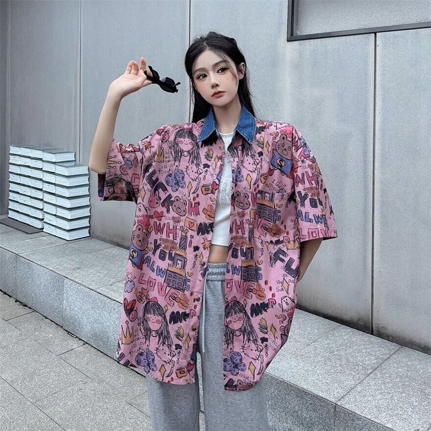 手書きイラスト風プリントがかわいい半袖シャツです
