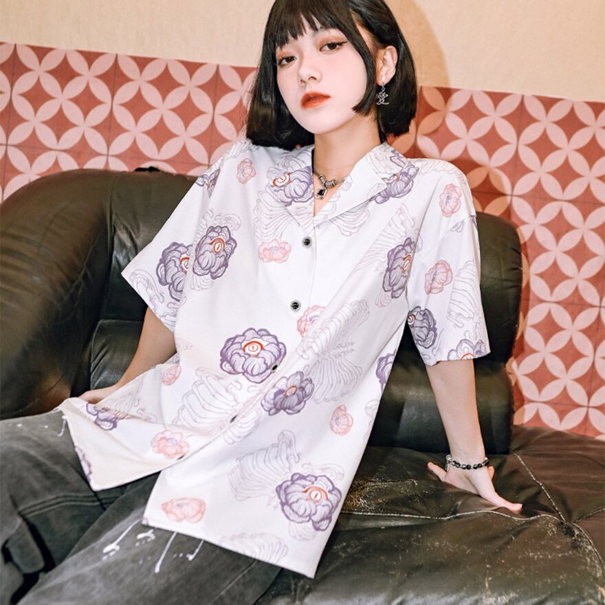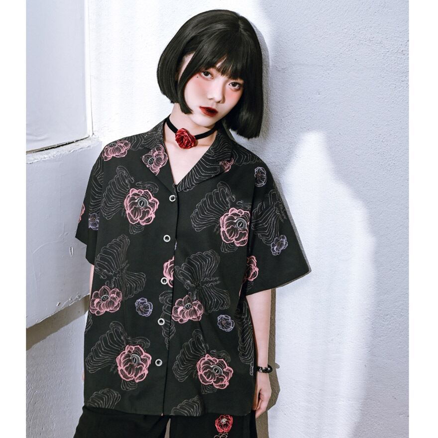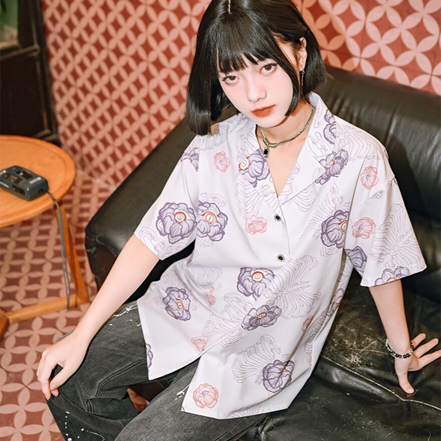 サブカル 服 地雷系 通販 チャイナ風服 チャイナ風服 古怪舎 半袖シャツ 中国風 羽織り トップス 花柄 総柄 闇かわいい