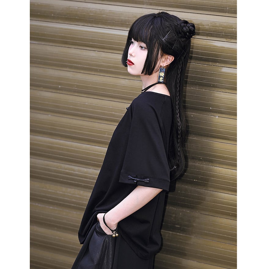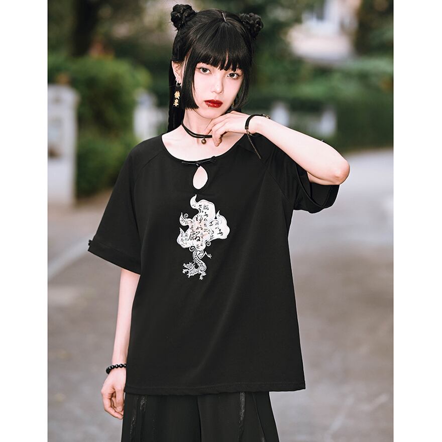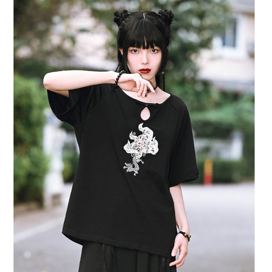 サブカル 服 地雷系 通販 チャイナ風服 チャイナ風服 古怪舎 Tシャツ 半袖 龍刺繍 ドラゴン トップス 闇かわいい