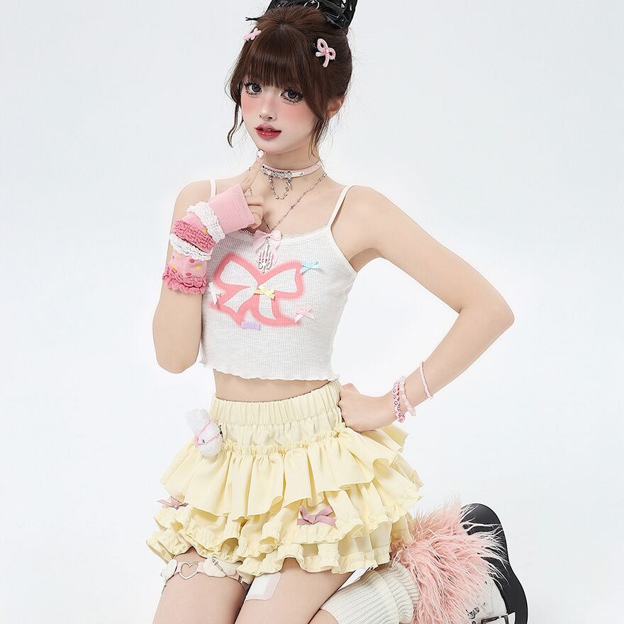 サブカル 服 地雷系 通販 CRAZYGIRL キャミソール 甘辛レース リボン メローカット 闇かわいい ストリート系イラスト 漫画プリント