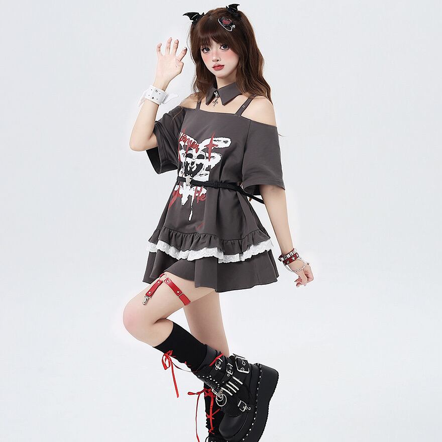サブカル 服 地雷系 通販 CRAZYGIRL 半袖トップス ミニワンピース チュニック レース フリル オフショルダー 闇かわいい ストリート系イラスト 漫画プリント