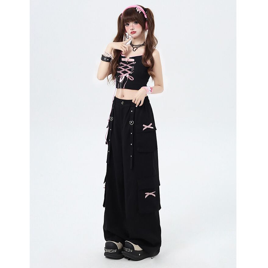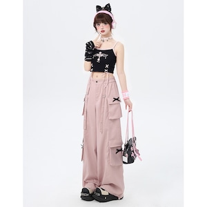 サブカル 服 地雷系 通販 CRAZYGIRL カーゴパンツ ワイドパンツ ルーズ ポケット リボン 闇かわいい ストリート系イラスト 漫画プリント