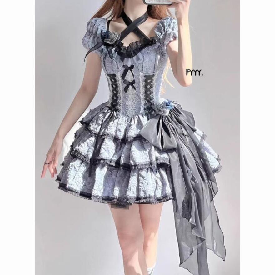 マットなグレーにレースアップ、三段切替スカートのジャンパースカートです
