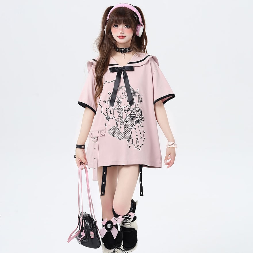 サブカル 服 地雷系 通販 セーラー服風 リボン 二次元美少女 オーバーサイズ 闇かわいい ストリート系イラスト 漫画プリント