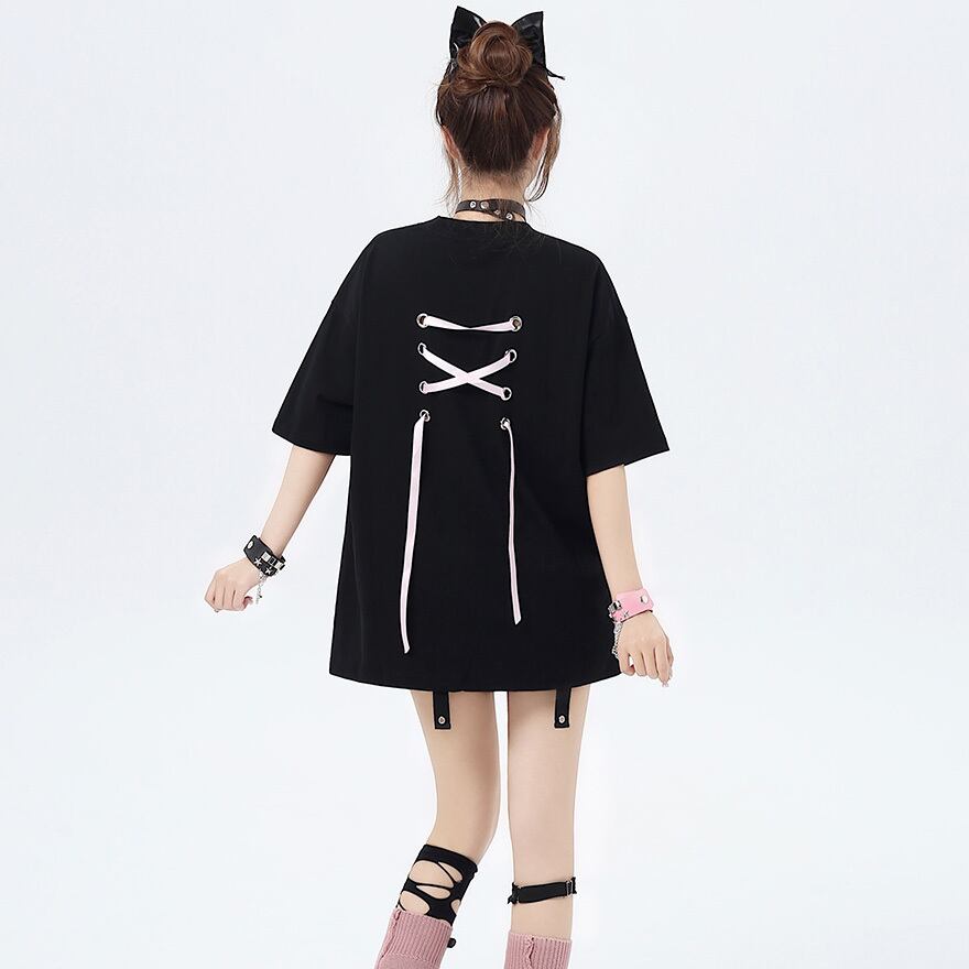 サブカル 服 地雷系 通販 半袖Tシャツ バタフライステッチ 蝶 リボン オーバーサイズ ゆったり 闇かわいい ストリート系イラスト 漫画プリント