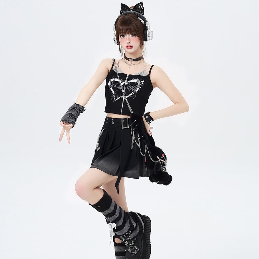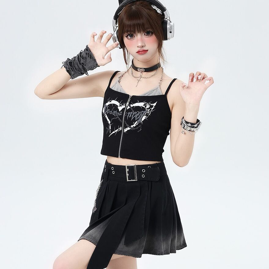 サブカル 服 地雷系 通販 キャミソール ジッパー ZIP レイヤード風 ミニ丈 闇かわいい ストリート系イラスト 漫画プリント