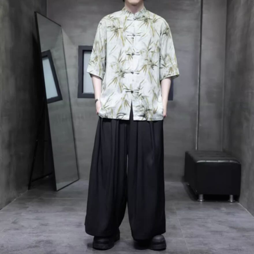 チャイナ風竹の葉フルプリントシャツメンズ半袖です。