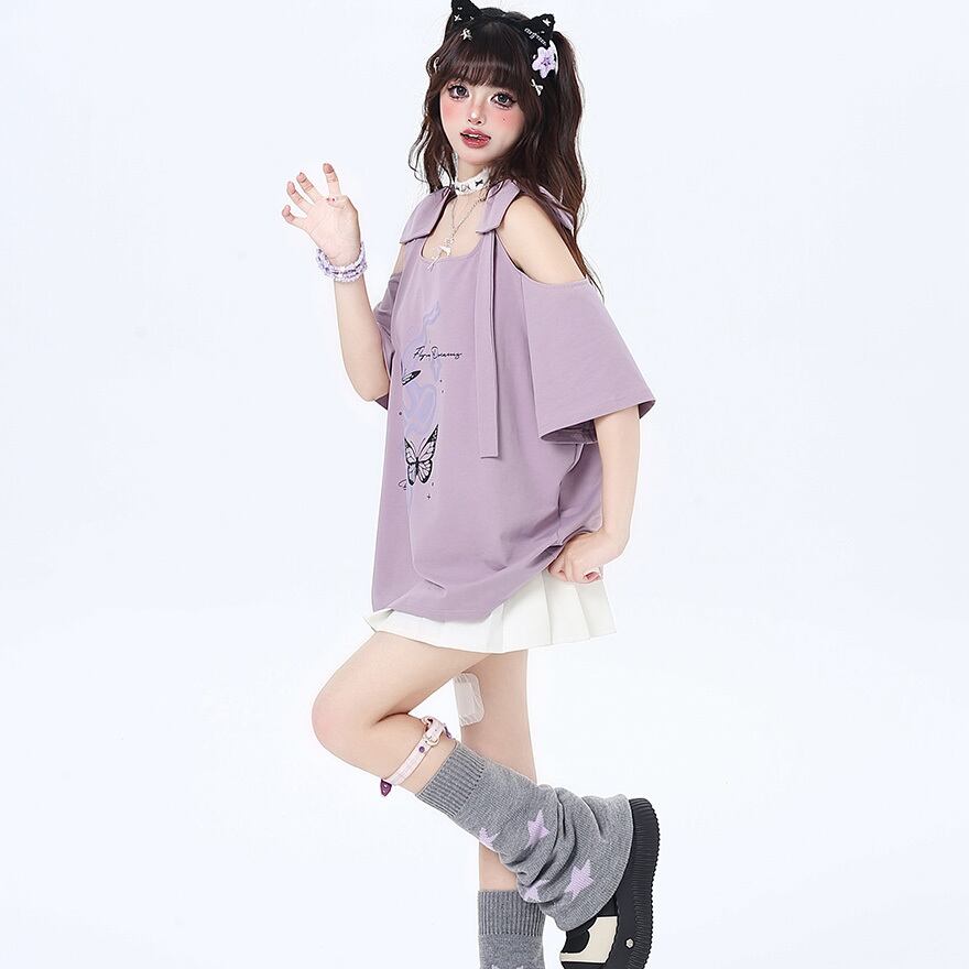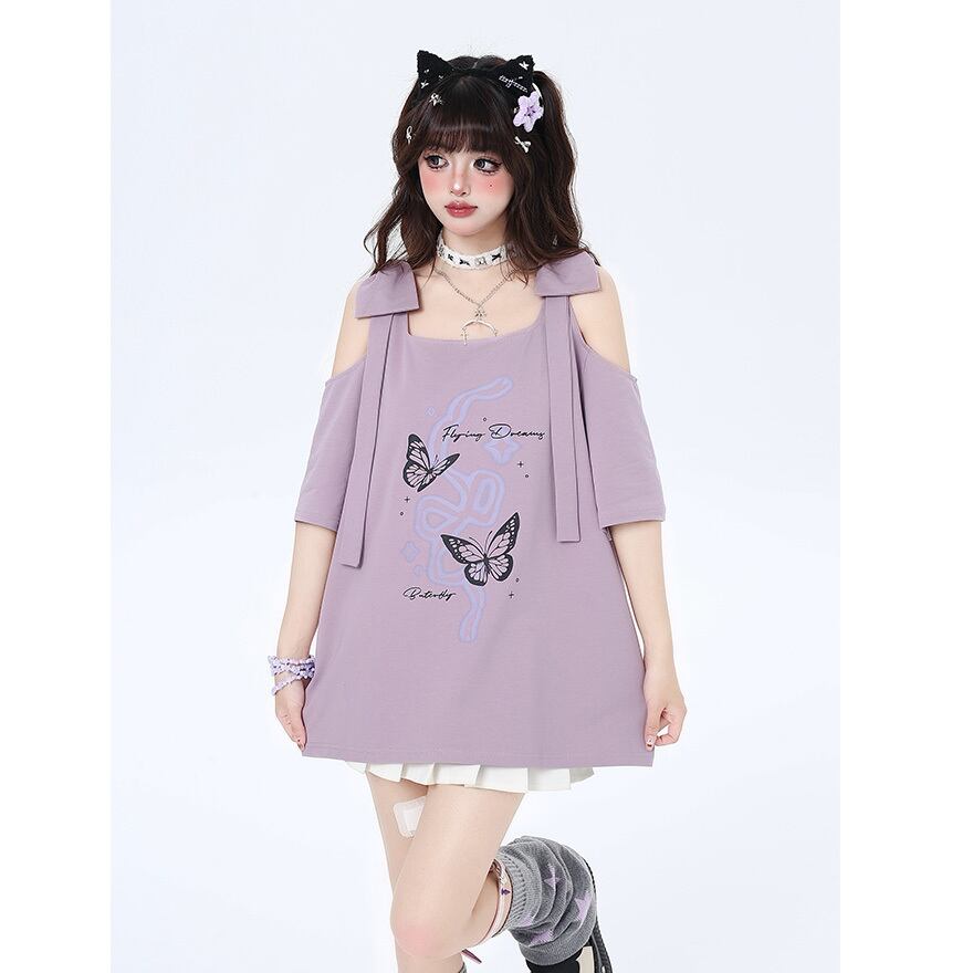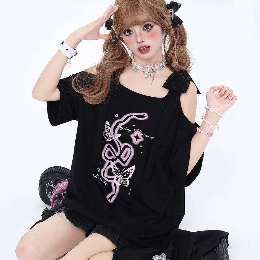 サブカル 服 地雷系 通販 オフショルダー 肩リボン バタフライプリント 闇かわいい ストリート系イラスト 漫画プリント