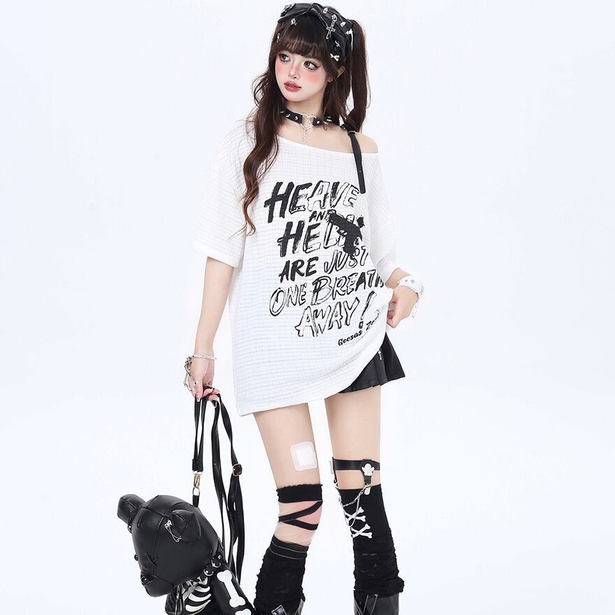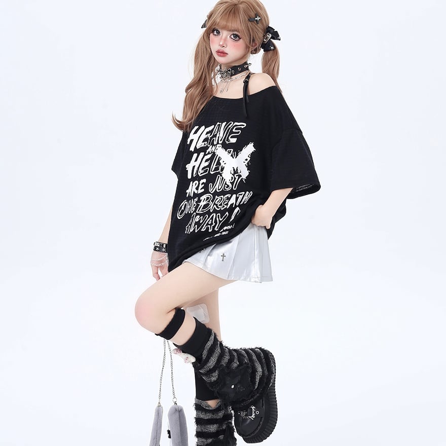 サブカル 服 地雷系 通販 半袖Tシャツ ワンショルダー ストラップ ロゴプリント 闇かわいい ストリート系イラスト 漫画プリント