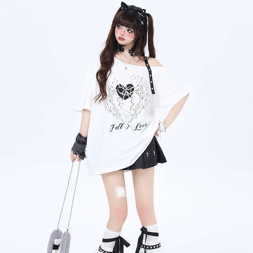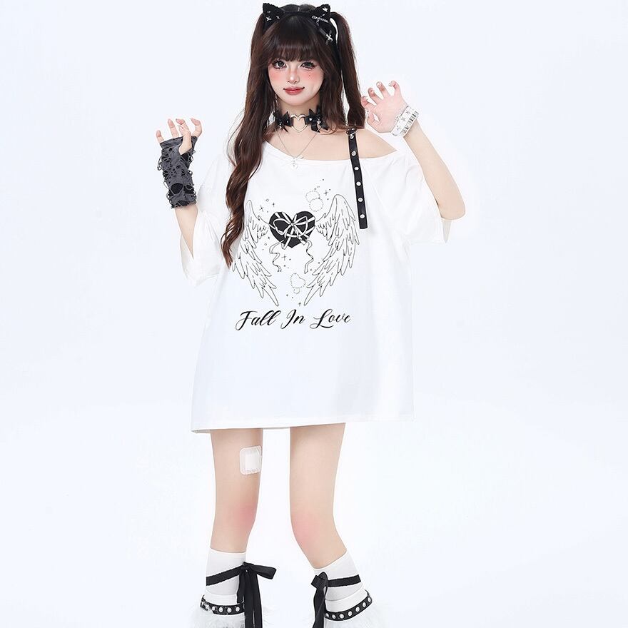 サブカル 服 地雷系 通販 半袖Tシャツ オフショルダー トップス プルオーバー ゆったり 闇かわいい ストリート系イラスト 漫画プリント