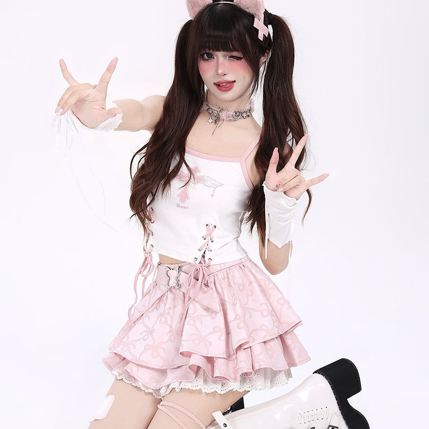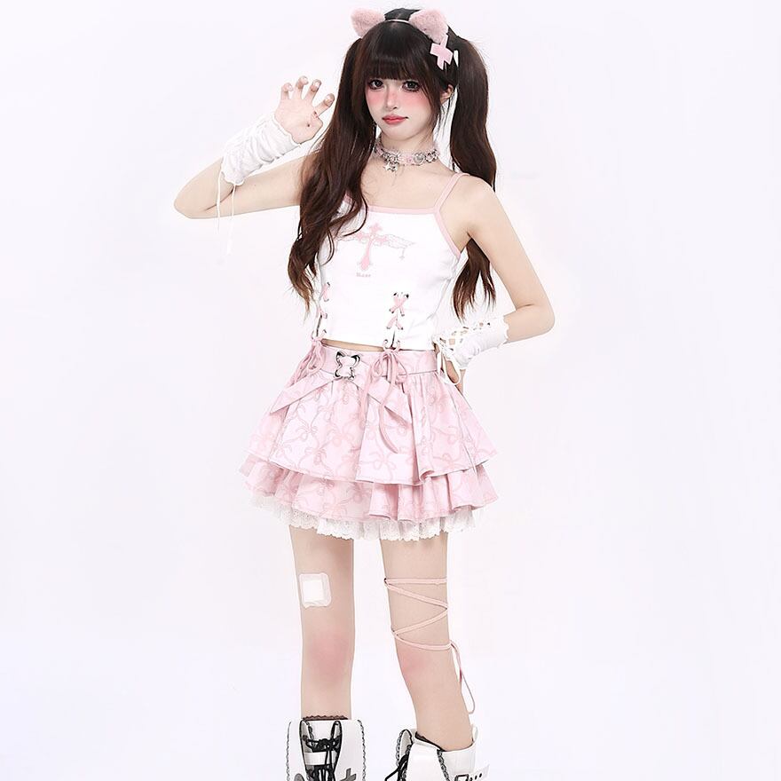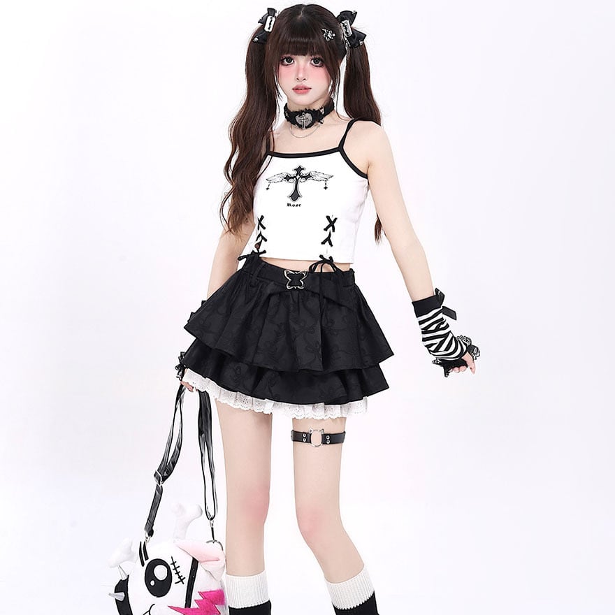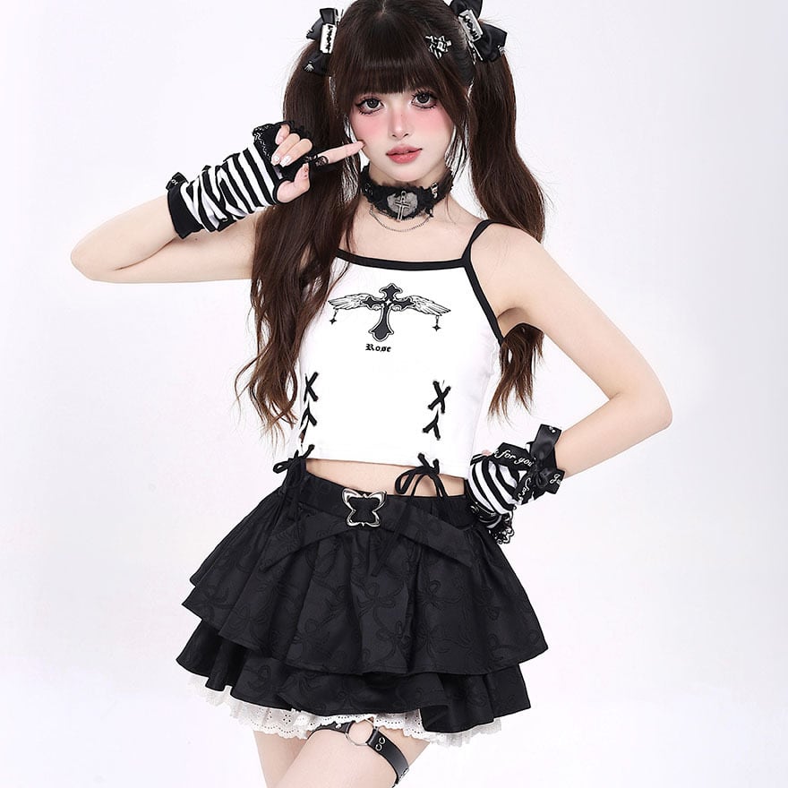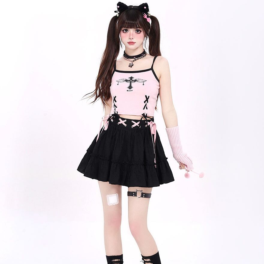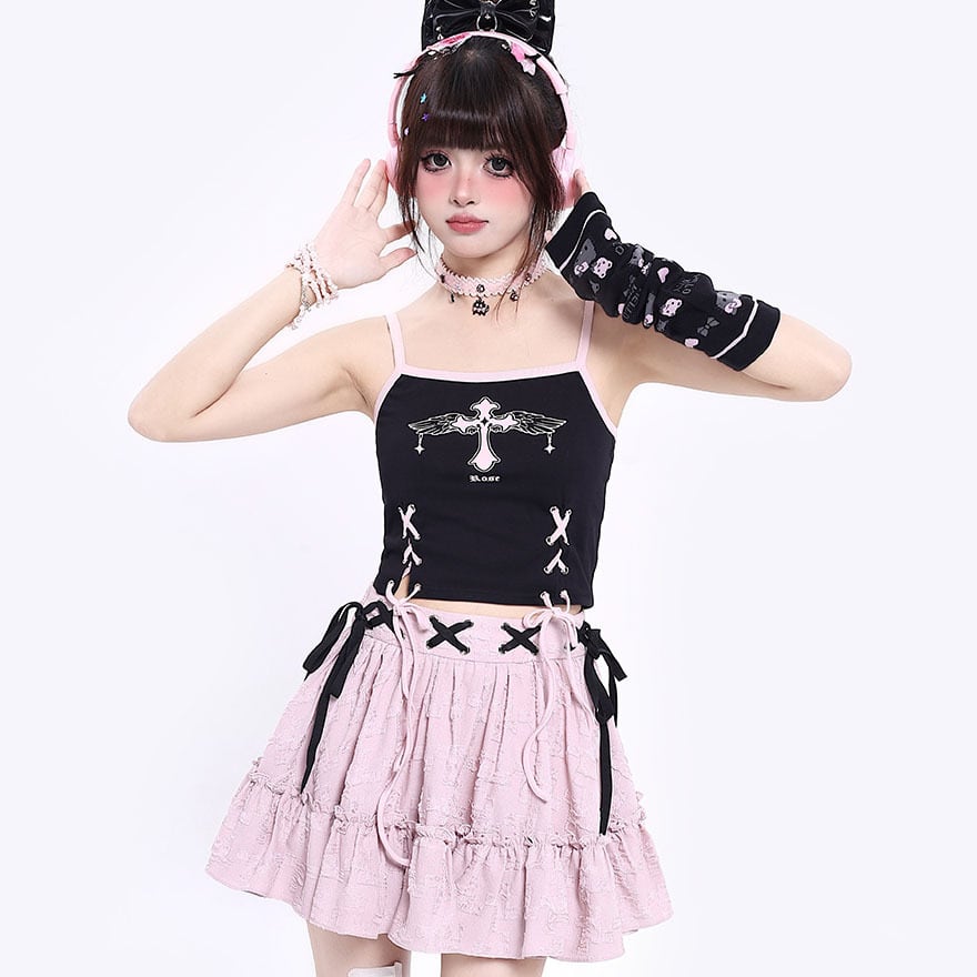 サブカル 服 地雷系 通販 即納 キャミソール トップス 十字架 レースアップ リボン 闇かわいい