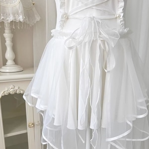 フリルにレースアップのデザインにスカートはシアーなレースレイヤードがおしゃれ増し