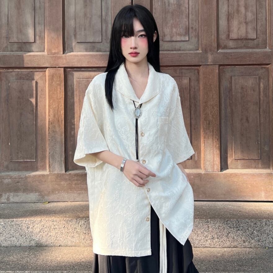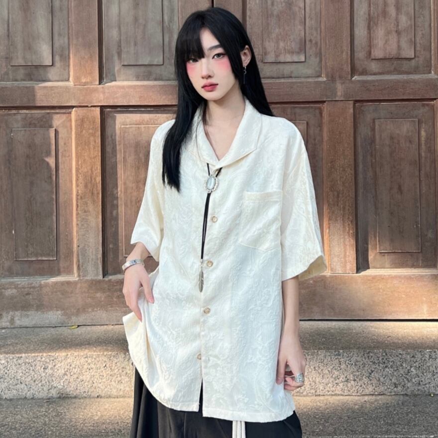 マットなつや消し柄にゆったりしたサイズ感のチャイナ風半袖シャツです。