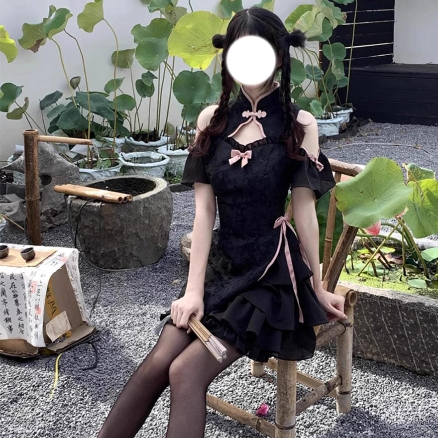 サブカル 服 地雷系 通販 ワンピース レース レイヤード 中華ロリータ 双子コーデオフショル ドレス