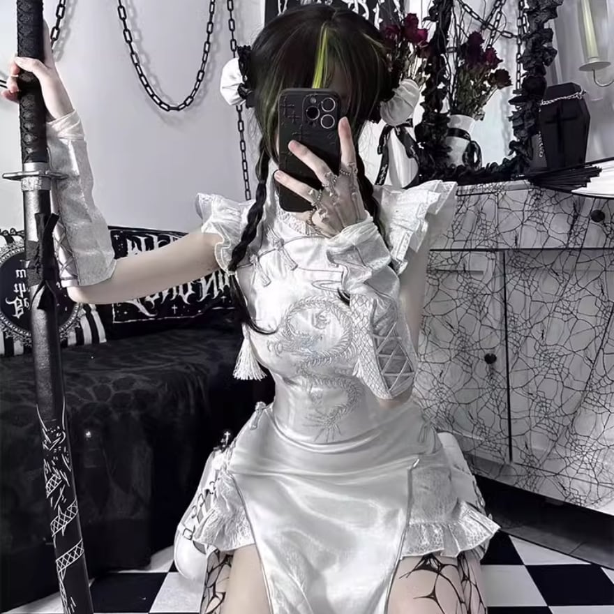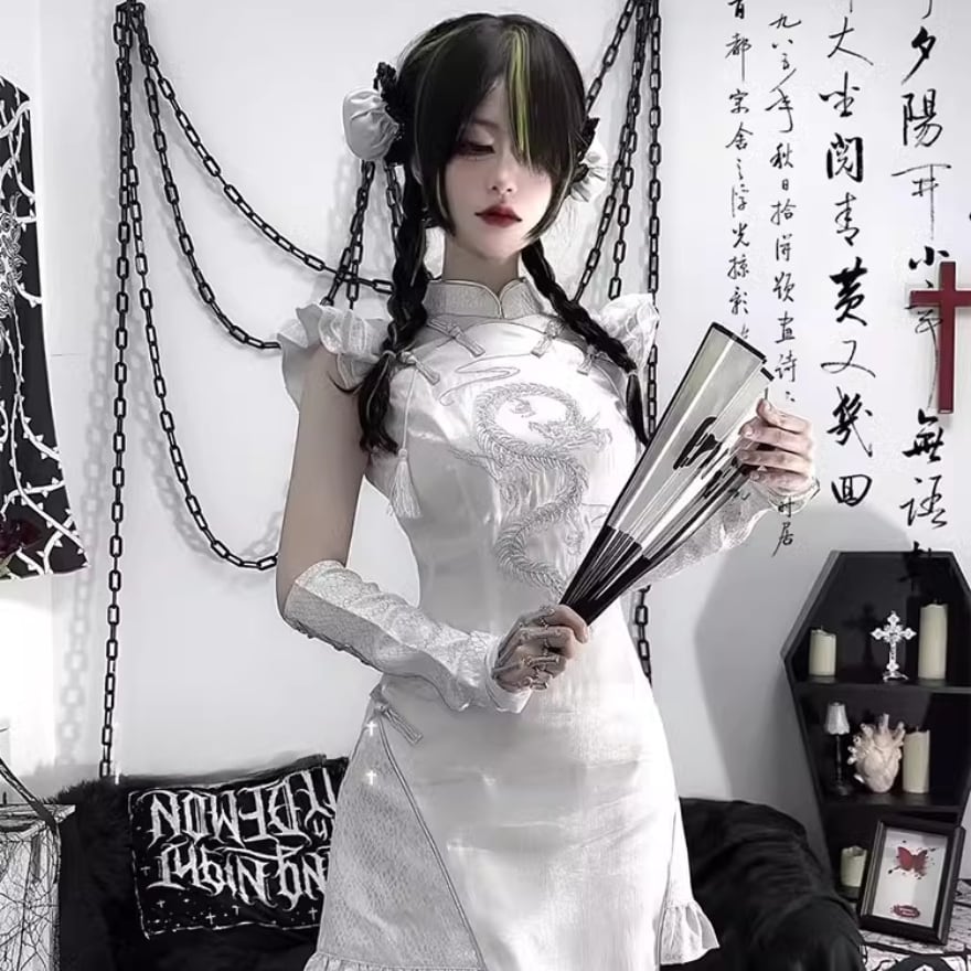 サブカル 服 地雷系 通販 ワンピース 中華ロリータ チャイナドレス ドラゴン ノースリーブ レイヤード かわいい 生誕祭 イベント衣装