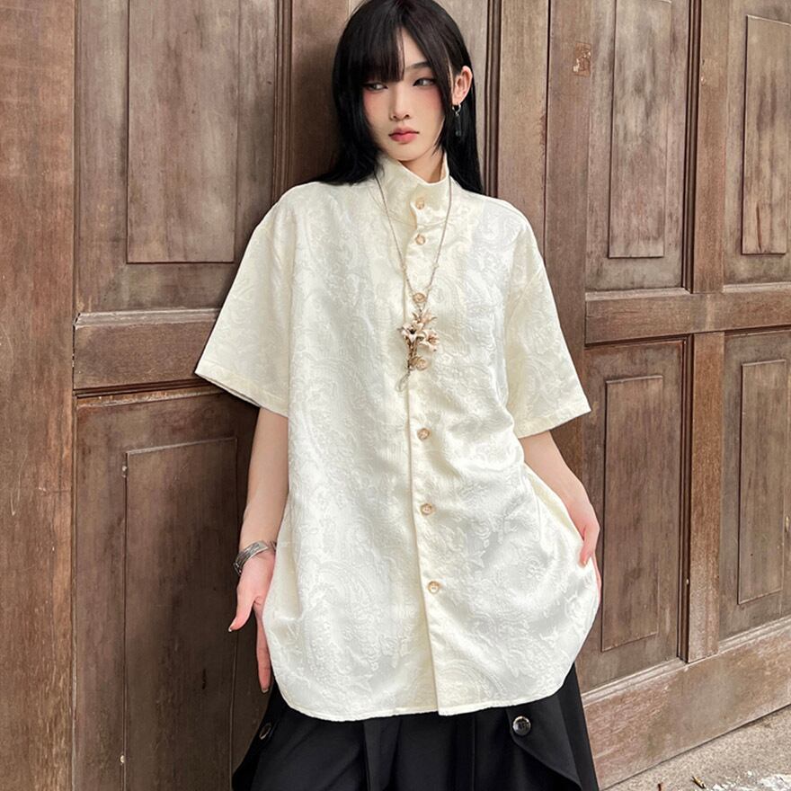 サブカル 服 地雷系 通販 ファッション 女子 半袖シャツ 刺繍 ジャガード ハイネック スタンドネック チャイナ風 中華 レトロ 闇かわいい ストリート系