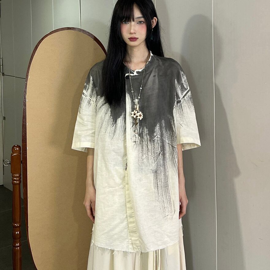 サブカル 服 地雷系 通販 ファッション 女子 半袖シャツ 絞り染め インクプリント ルーズ 羽織り チャイナ風 中華 レトロ 闇かわいい ストリート系