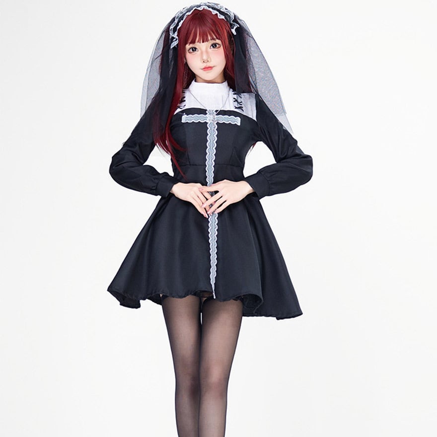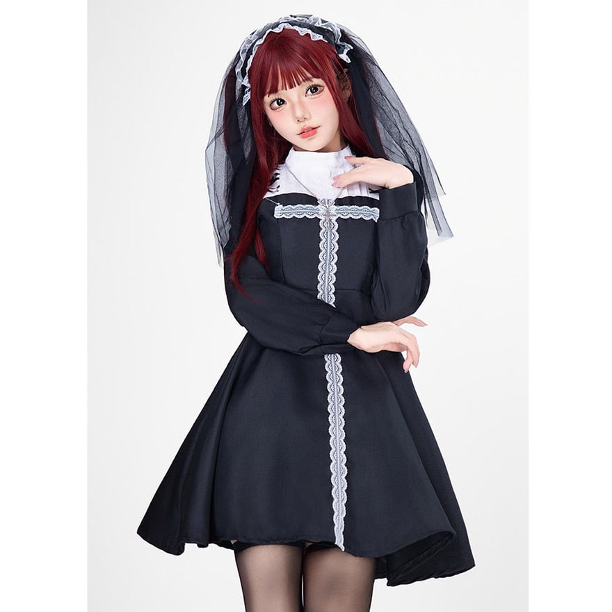 サブカル 服 地雷系 通販 コスプレ 修道女 ワンピース シスター ゴシック 3点セット ベール コスプレ 修道女 イベント ハロウィン