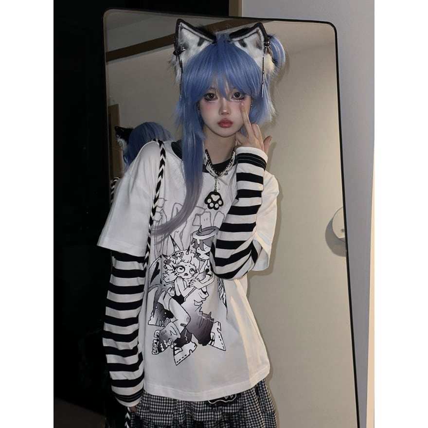 サブカル 服 地雷系 通販 Tシャツ フェイクツーピース ボーダー袖 イラスト プリント闇かわいい Y3K アニメ