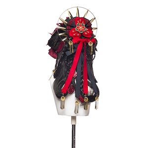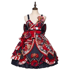 伝統的な矢絣(ヤガスリ)柄が大正浪漫を感じさせる、派手で豪華絢爛なジャンパースカート、ブラウス、ヘッドドレス、アクセサリーが3点セットになっています。どこかノスタルジックな雰囲気漂うデザインで、舞台衣装やイベント衣装、撮影会など、幅広いシーンで活躍すること間違いなし!