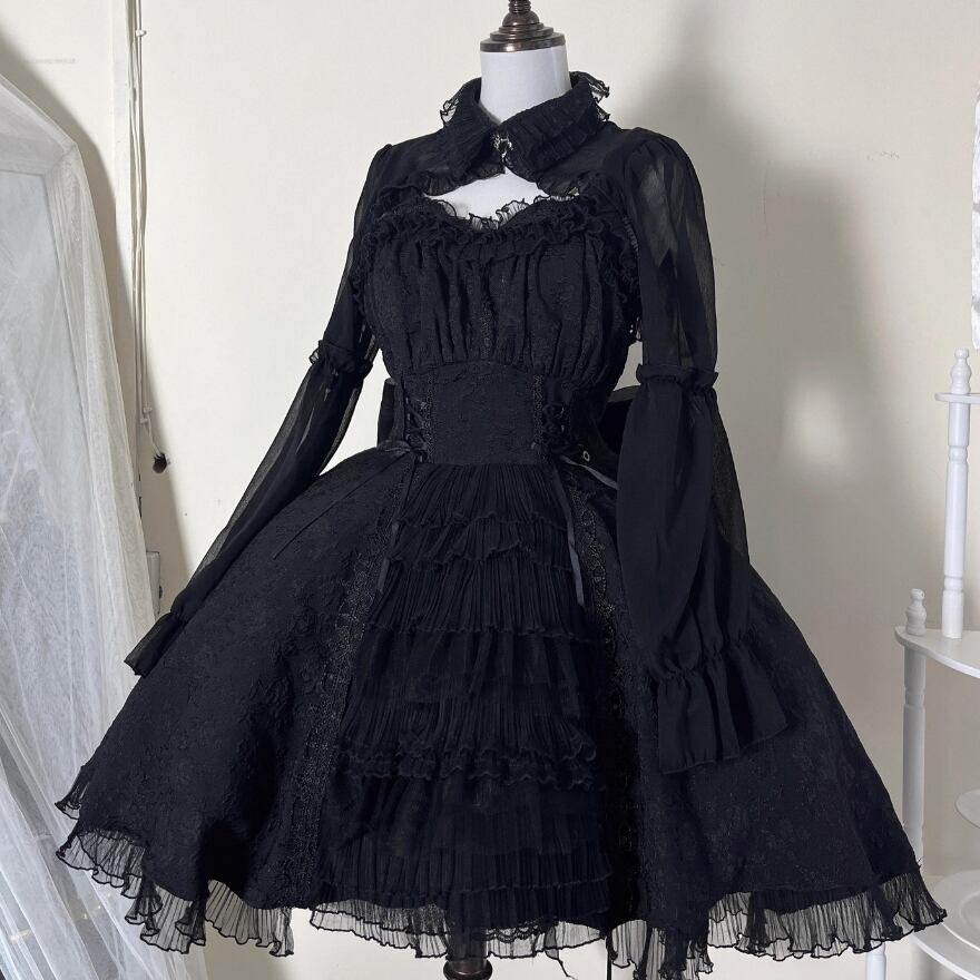 ヘルシーなミニ丈のジャンパースカートにショート丈ブラウス、バックリボンのゴスロリ3点セットです