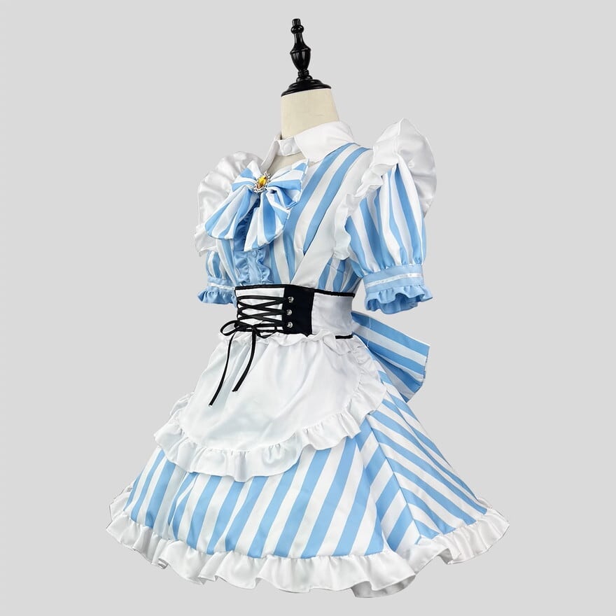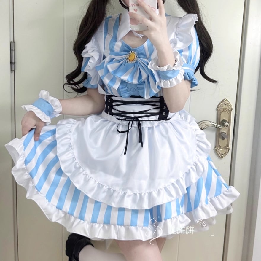 ストライプ柄の水色がビジュアル抜群なメイドワンピースにカチューシャ、ハンドカバーのセット商品です。