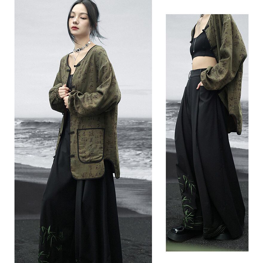 サブカル 服 地雷系 通販 ワイドパンツ ボトムス フレア ルーズ 柳の葉 ポケット チャイナ風 中華風デザイン 大人かわいい