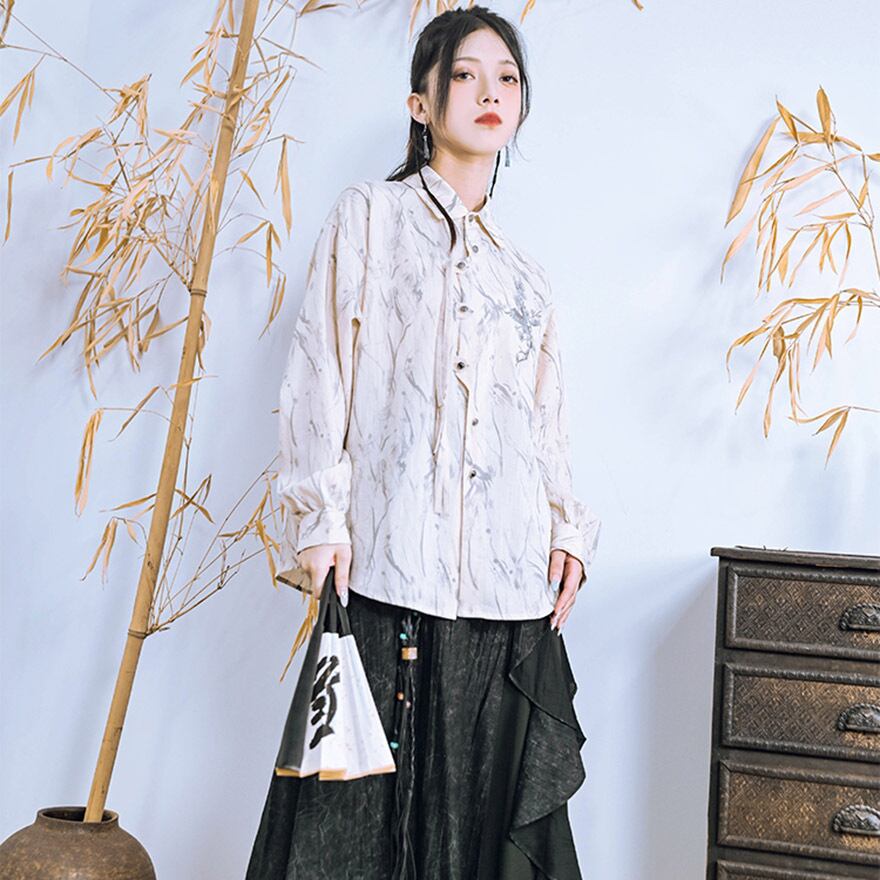 留め具とタッセルがお洒落な長袖シャツです。