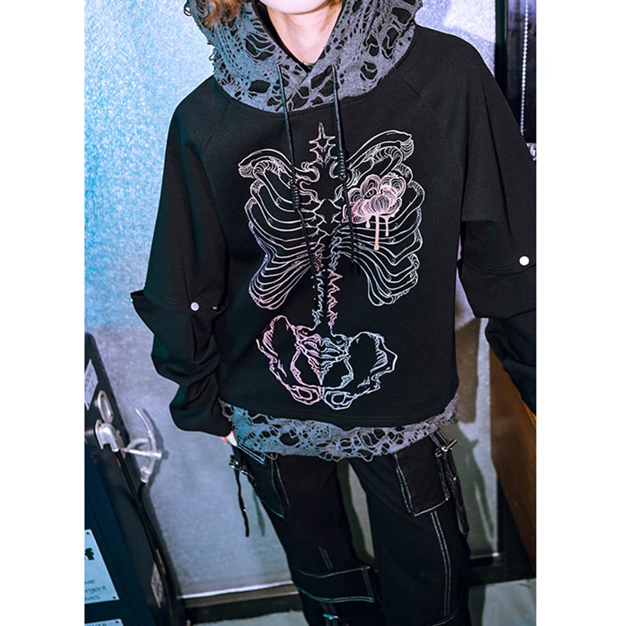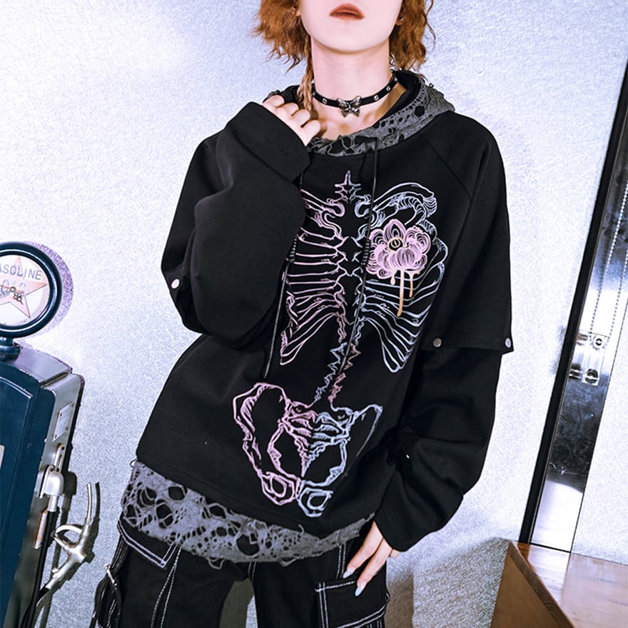 サブカル 服 地雷系 通販 チャイナ風服 チャイナ風服 古怪舎 パーカー フード付きスウェット フラワーボーン クラッシュダメージ プルオーバー 闇かわいい