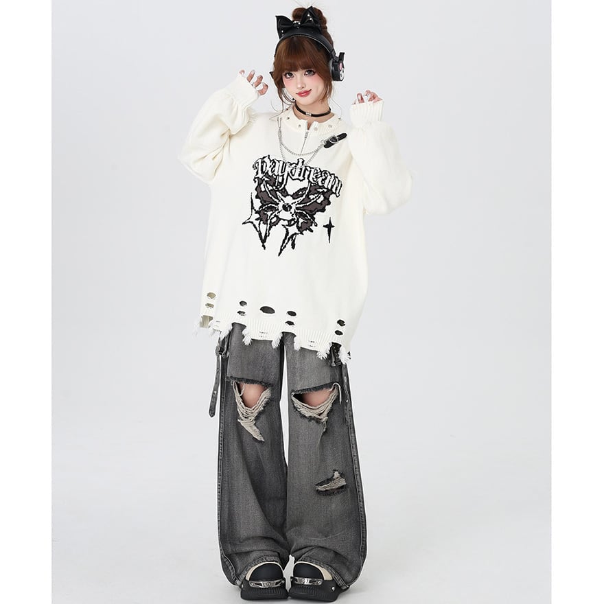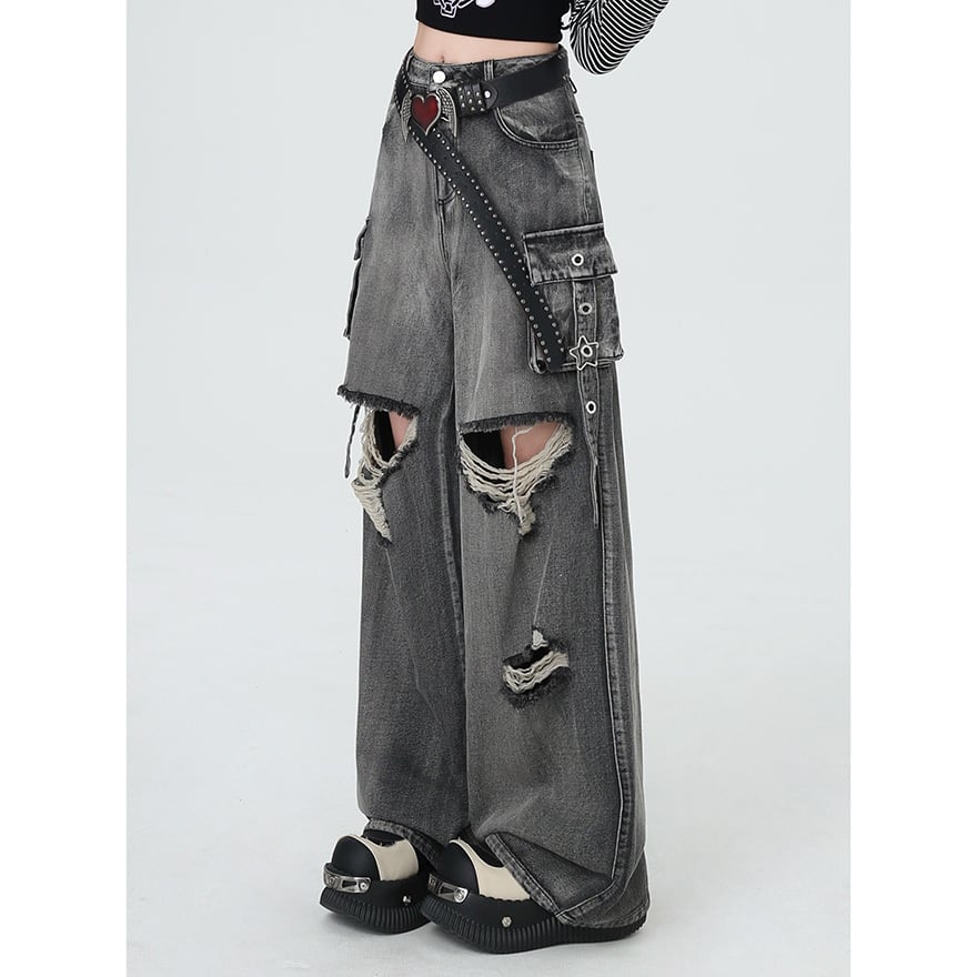 サブカル 服 地雷系 通販 CRAZYGIRLシリーズ デニムパンツ ジーンズ ダメージ加工 ユーズド風 ポケット ワイド