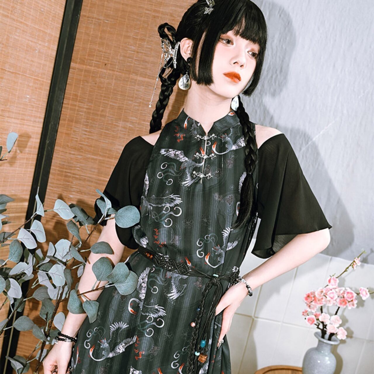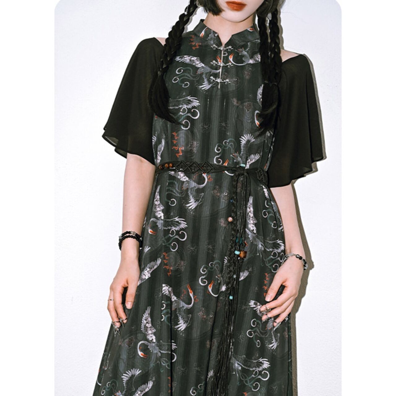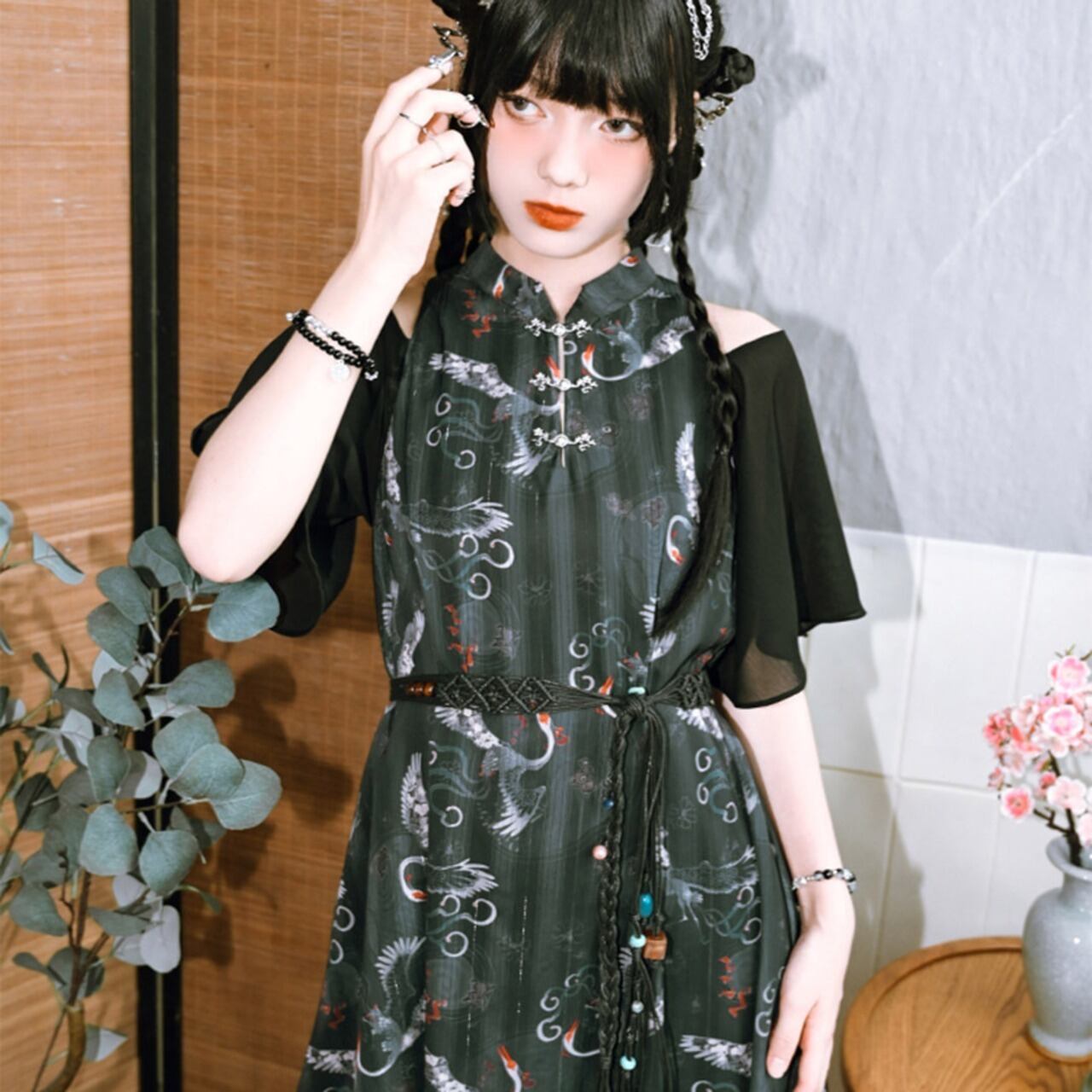 サブカル 服 地雷系 通販 チャイナ風服 古怪舎闇かわいい 半袖ワンピース オープンショルダー 裾レース 透け感 鶴 総柄 チャイナ風