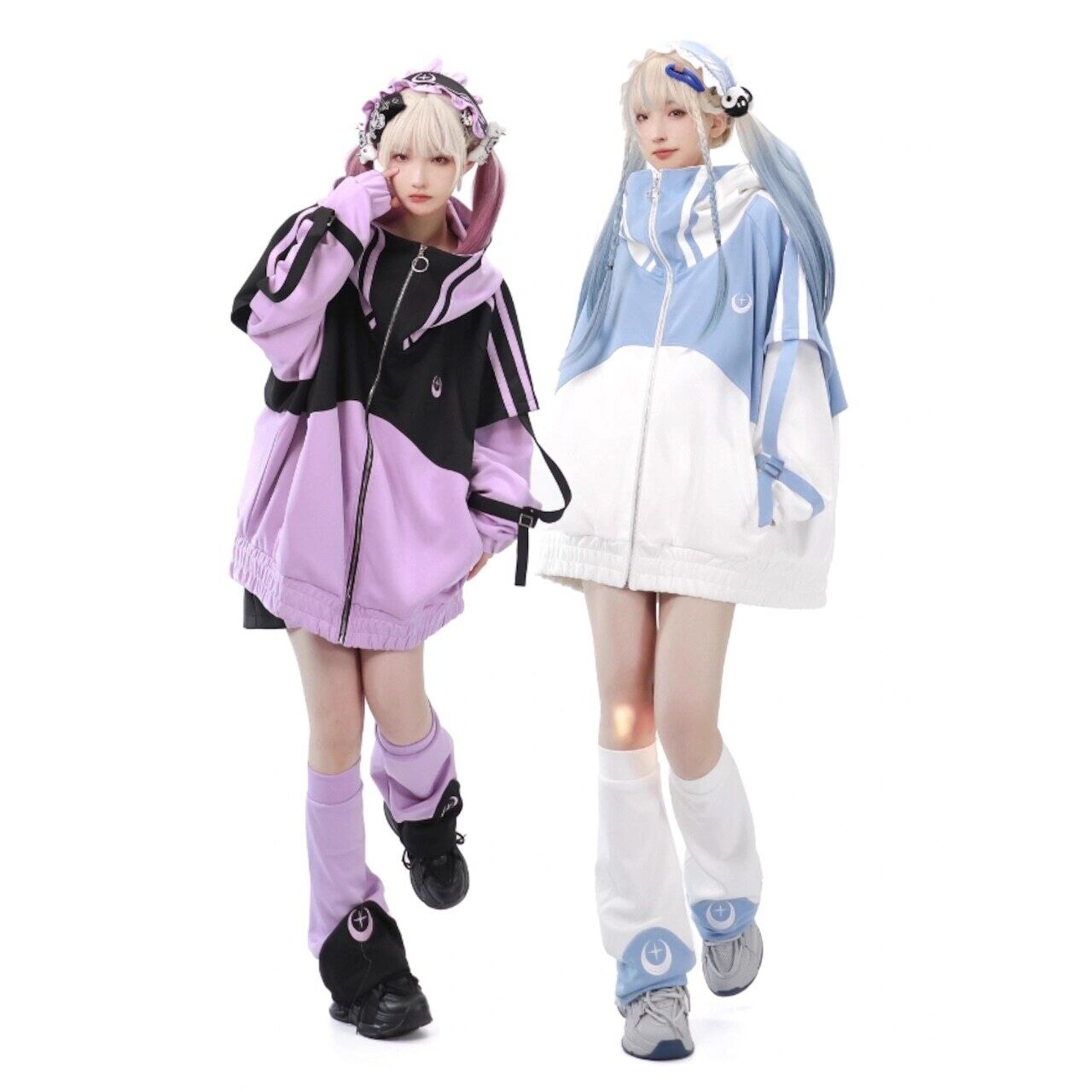 サブカル系地雷ファッション人気のオーバーサイズジャージジャケットとハーフパンツ、刺繍入りレッグカバーとヘッドドレスの4点フルセットです