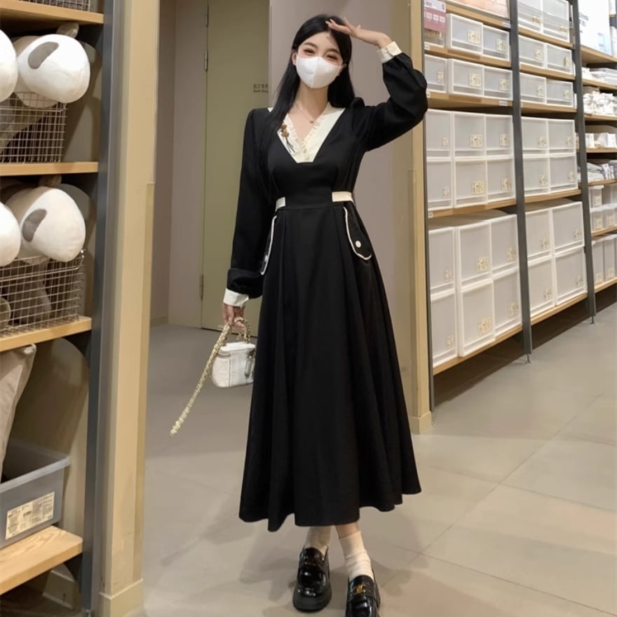 普段着使いにおすすめな控えめⅤ字ネックのロングワンピになります
