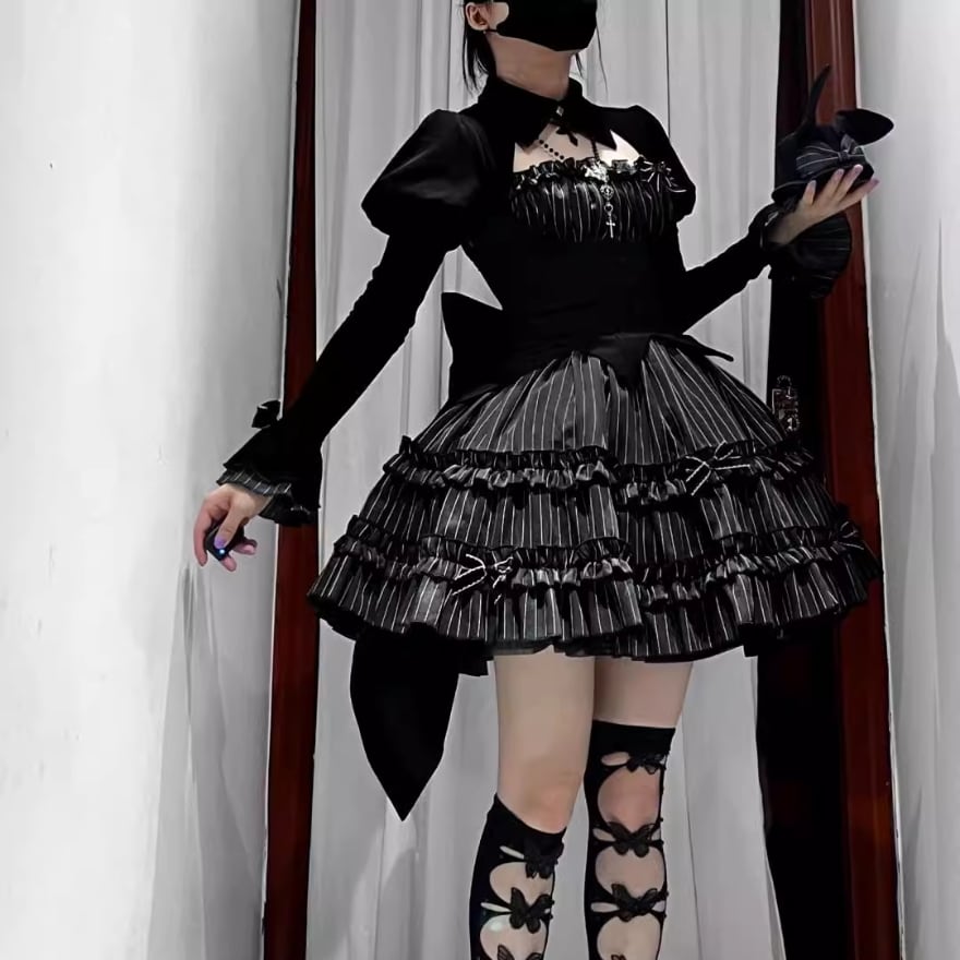 ストライプ柄のふんわりスカートが可愛いエレガントなダークゴシックドレスです。
