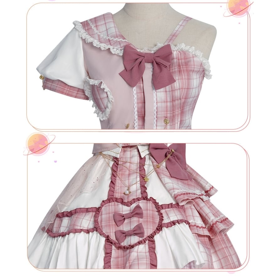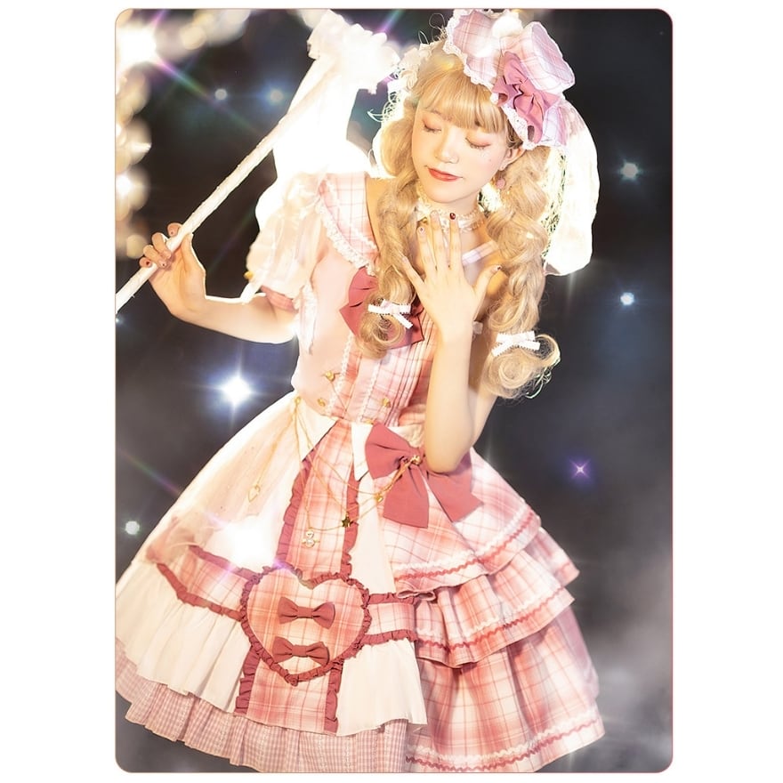 ピンクのロリータショートドレスには、帽子、トップス、スカートの3つのディテールが含まれています。