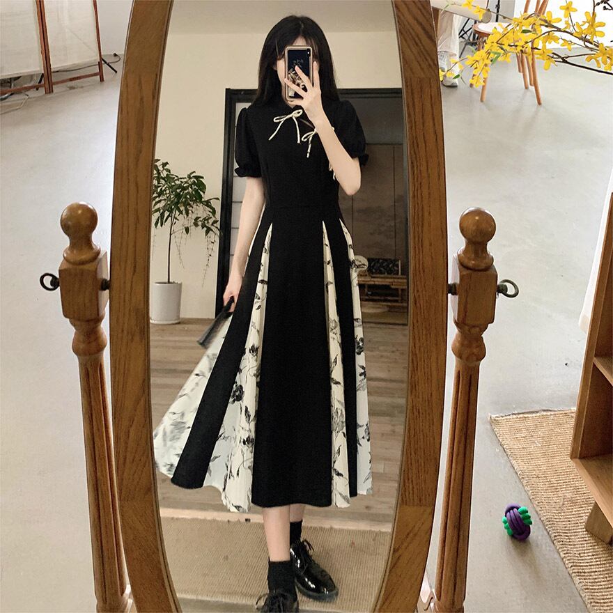 サブカル 服 地雷系 通販 ロングワンピース 半袖 パフスリーブ 花柄 リボン ロング丈 中華ロリータ 華ロリ 上品 大人増し 大人ロリータ 量産型