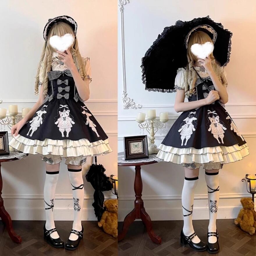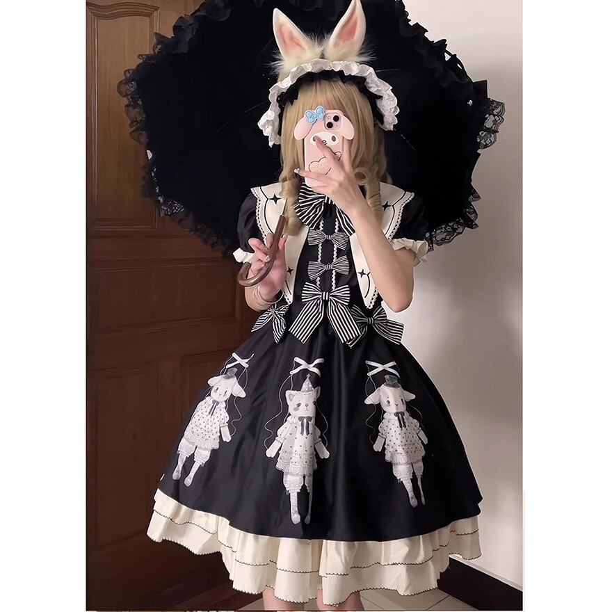 サブカル 服 地雷系 通販 予約販売 半袖ワンピース ビッグカラー 大きめ襟 リボン 子猫 子羊 ゴスロリ アニマルプリント柄 ろりぃた