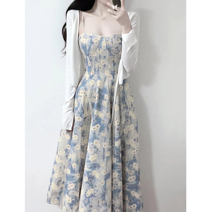 花柄がお洒落な細見えワンピースとカーディガンのセットです。