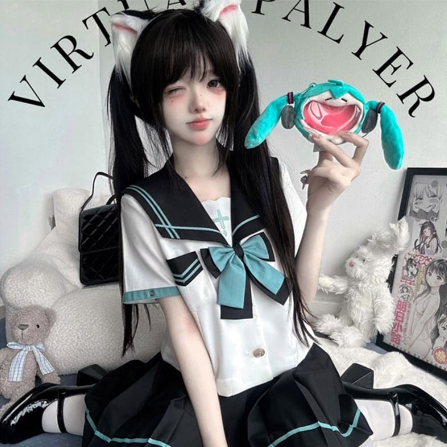 サブカル 服 地雷系 通販 セーラー服 ミニスカート オープンショルダー リボン JK制服 2点 セットアップ 中華ロリータ 原宿スタイル 双子コーデ ろりぃた
