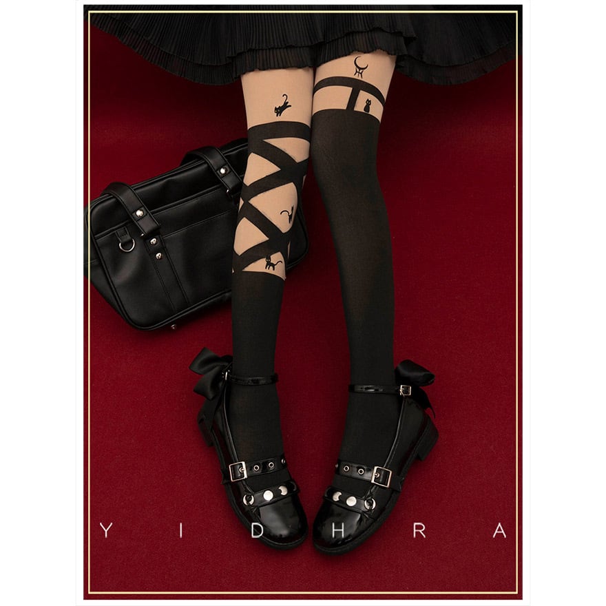 サブカル 服 地雷系 通販 ストッキング タイツ 猫 ソックス風 アシンメトリー ゴスロリ