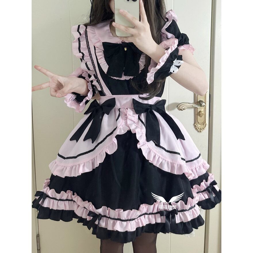 サブカル 服 地雷系 通販 メイド服 猫耳カチューシャ フリル リボン 4点セット メイドカフェ コンカフェ 猫耳カチューシャ付き