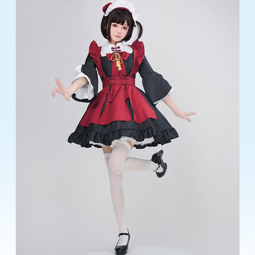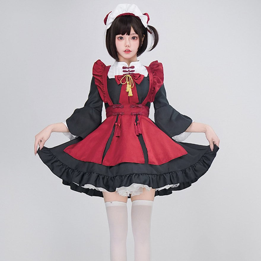 サブカル 服 地雷系 通販 ワンピース エプロン カチューシャ リボン フレアスリーブ 中華ロリータ メイド服 6点セット メイドカフェ コンカフェ